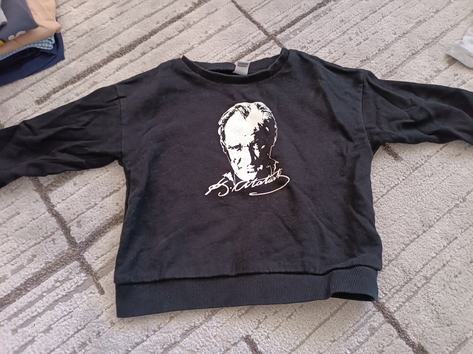 Siyah, örgü pamuk kumaştan yapılmış, baskılı ve bol kesim kız çocuk kısa kollu tişört. Atatürk baskılı imzalı