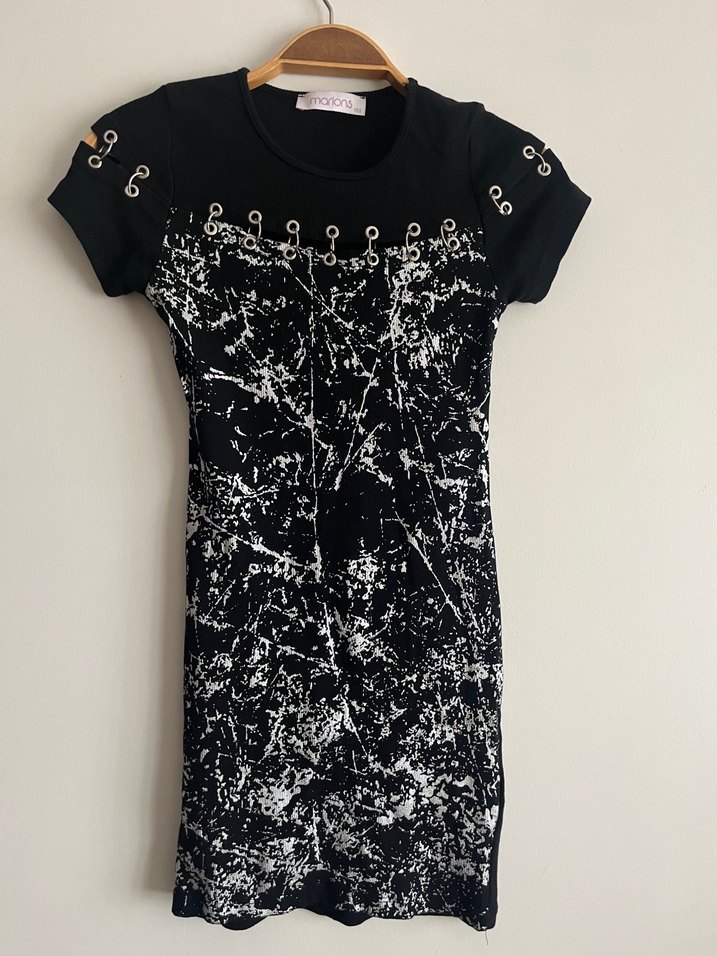 Penye kumaş ve metal aksesuarları var. Fotoğraf çekimi için alındı bir kez giyildi. En 30cm (10cm esneyebilir), boy 80cm.