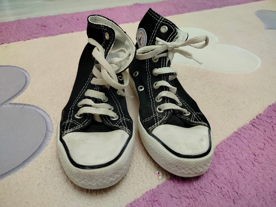 Düz tabanlı, siyah beyaz bağcıklı çocuk spor ayakkabısı. Günlük kullanıma uygun, rahat ve desen içermeyen grunge punk tarzında.