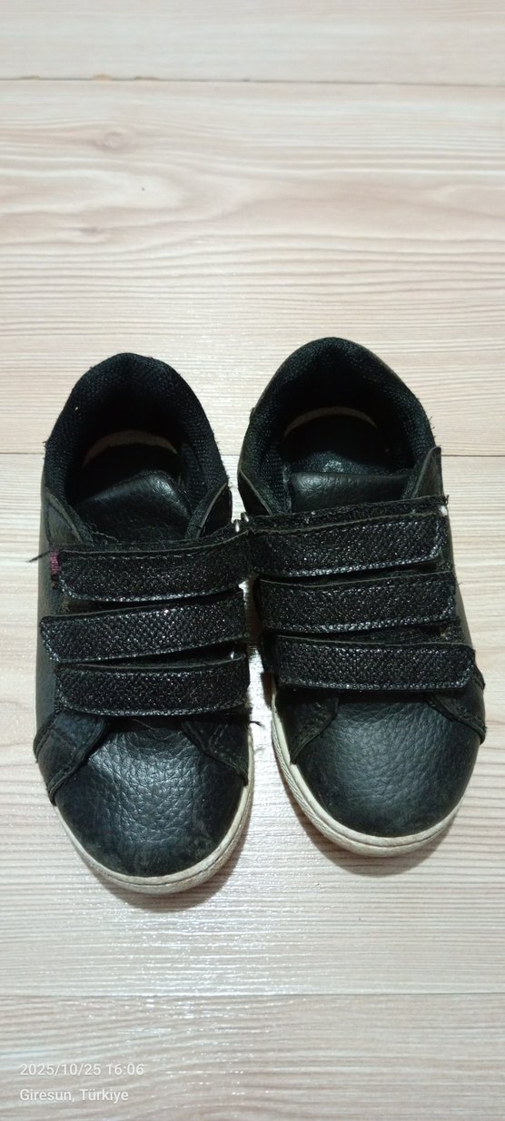 çocuklar için siyah cırt cırtlı, kauçuk tabanlı spor ayakkabı. Sokak stili ve rock punk havası taşıyan desensiz tasarım.