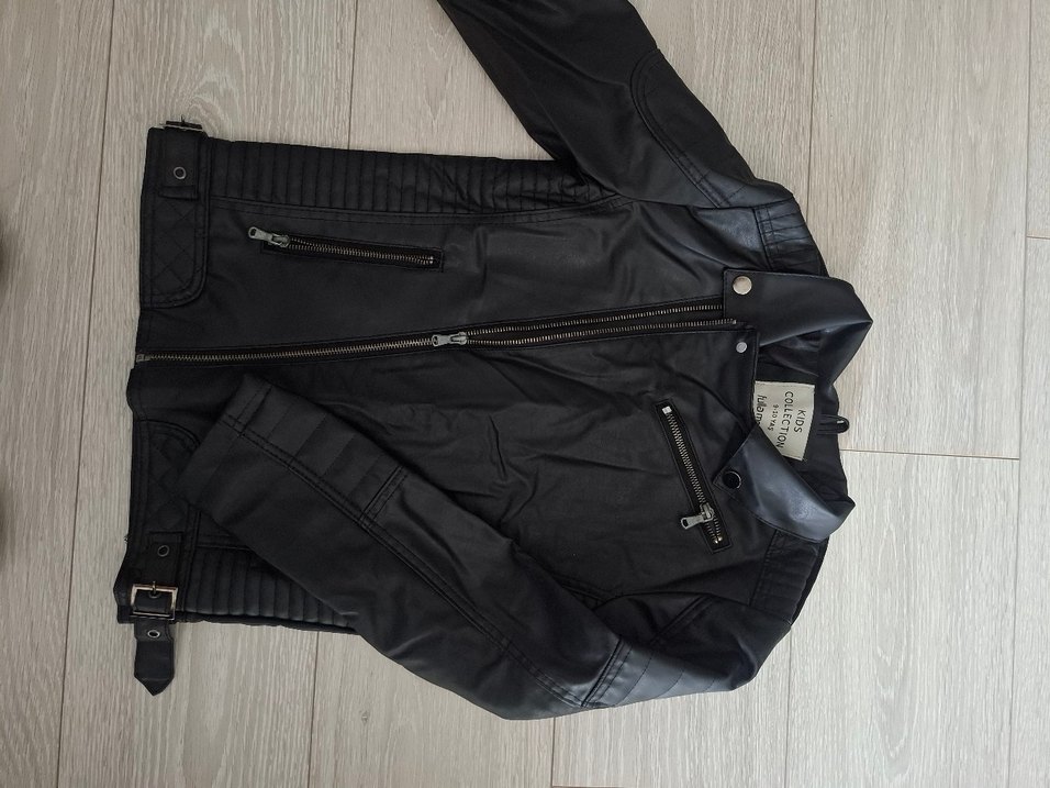 Fermuarlı, kesimli yaka ve askılı kollara sahip siyah deri biker ceket. Orta boyda, dar kesim ve günlük şıklık için uygun.