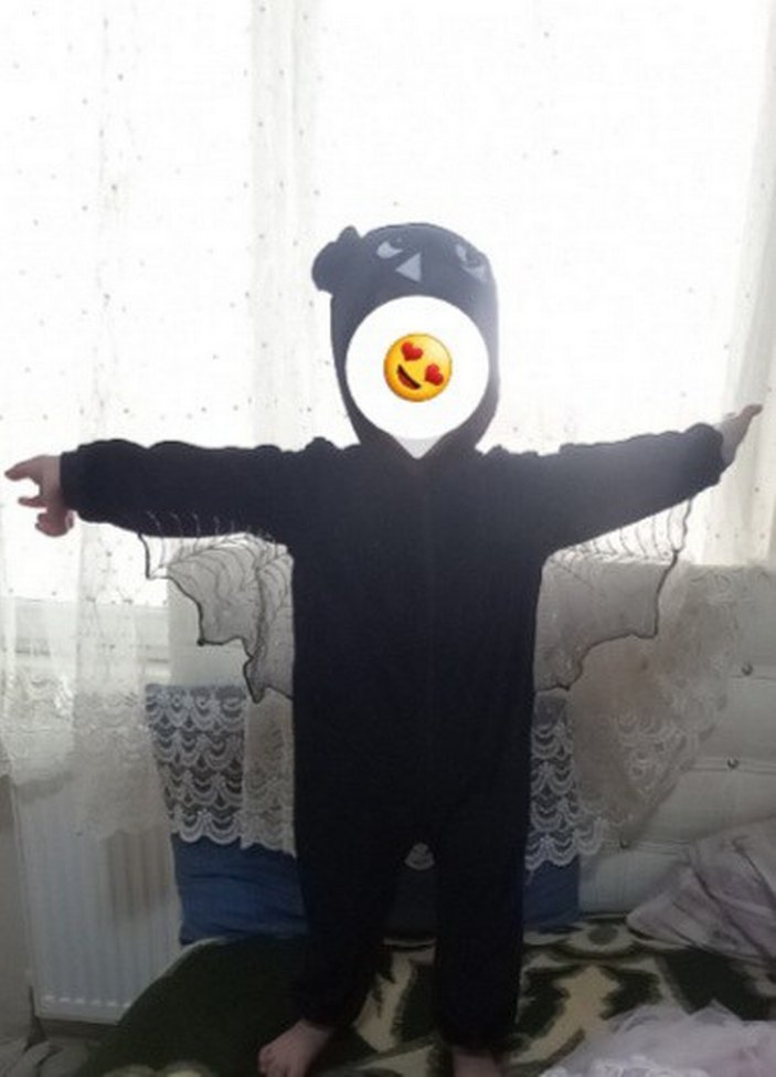 Siyah yarasa kostüm, dar kesim çocuk tulumunda boğazlı yaka, uzun kollu ve transparan tül detaylı kanatlar bulunur. Gotik ve rock punk havası verir ve pazarlık yapılır.