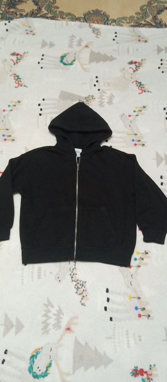 çocuklar için siyah kapüşonlu, fermuarlı ve uzun kollu sweatshirt. Yumuşak ve sıcak tutan kumaştan, bol kesim ve sokak stili için uygun.