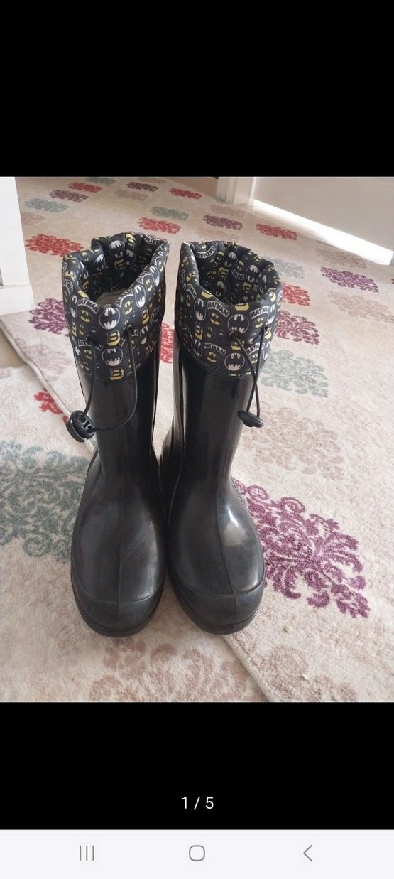 Çocuklar için siyah lastik botlar, gotik tarzda. Üst kısmında batman figürü vardır. az kullanıldı