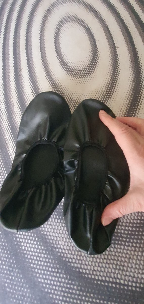 Siyah lastikli çocuk bale ayakkabısı, esnek kauçuk malzemeden yapılmış, düz desensiz yüzeye sahip. 1 kez kullanıldı
