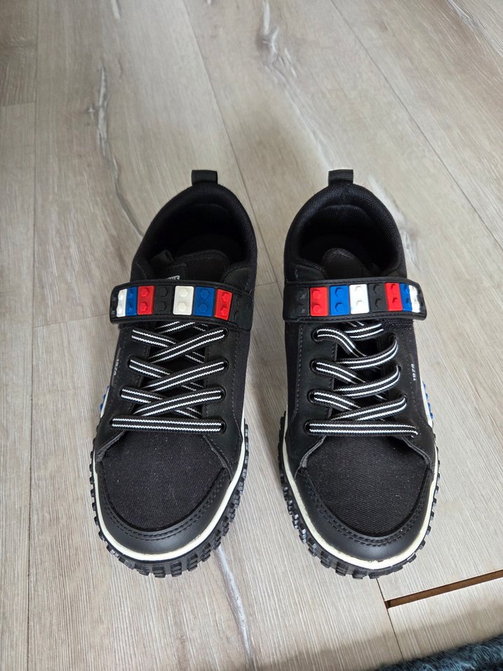 Siyah taban üzerine renkli çizgilerle tasarlanmış çocuk spor ayakkabısı, cırt cırtlı bant ve dayanıklı kauçuk taban ile rahat kullanım sağlar.