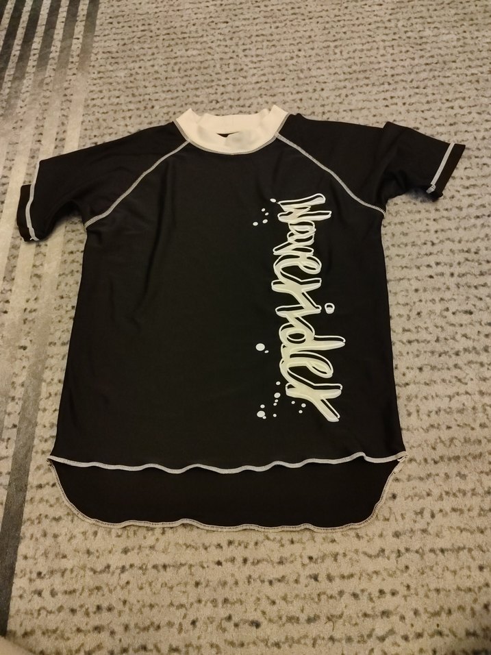çocuk siyah pilaj tişört, kısa kollu, yuvarlak yakalı ve bol kesimdir. 'Waverider' baskılı ve fırfır detaylıdır.