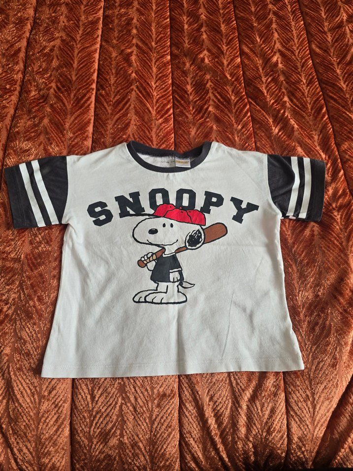 Kız yada erkek çocuk için kısa kollu, bisiklet yaka ve bol kesim tişört. Örme pamuk kumaştan, gri ve kahverengi tonlarında, Snoopy baskılıdır.