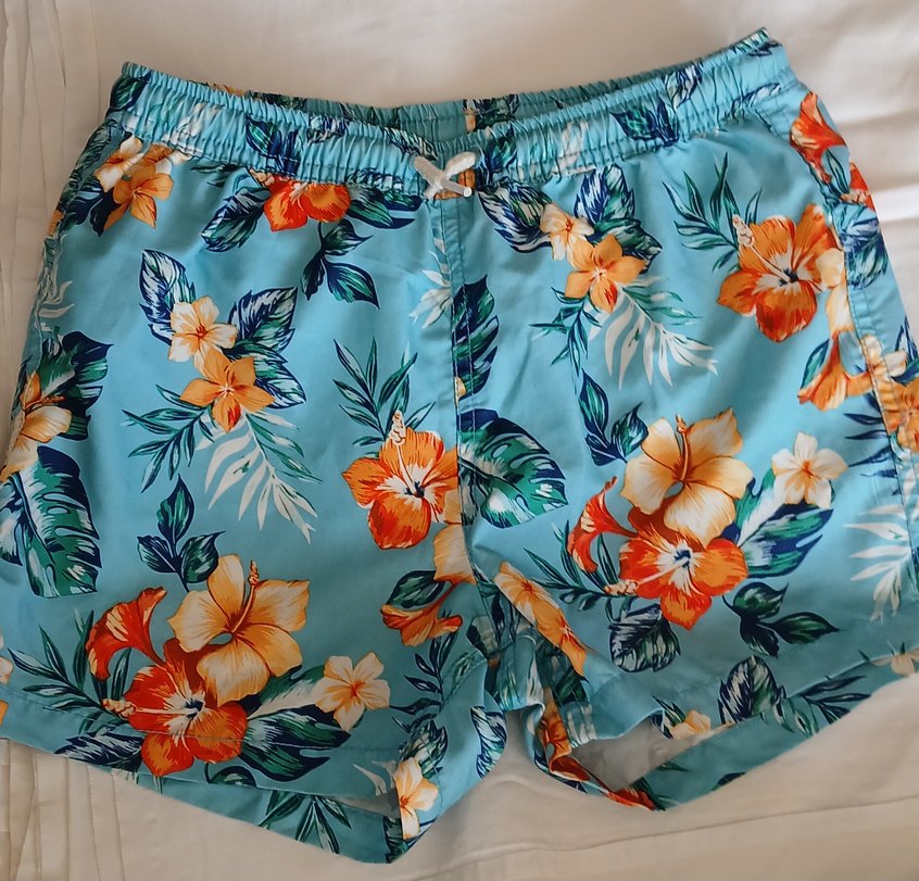 Mavi zemin üzerine renkli çiçek desenli, ayarlanabilir bağcıklı ve lastikli erkek çocuk mayo şortu. 9-10 yaş aralığı kumaş çok güzeldir tek kusuru iç filede kopukluk var kullanıma engel değil.