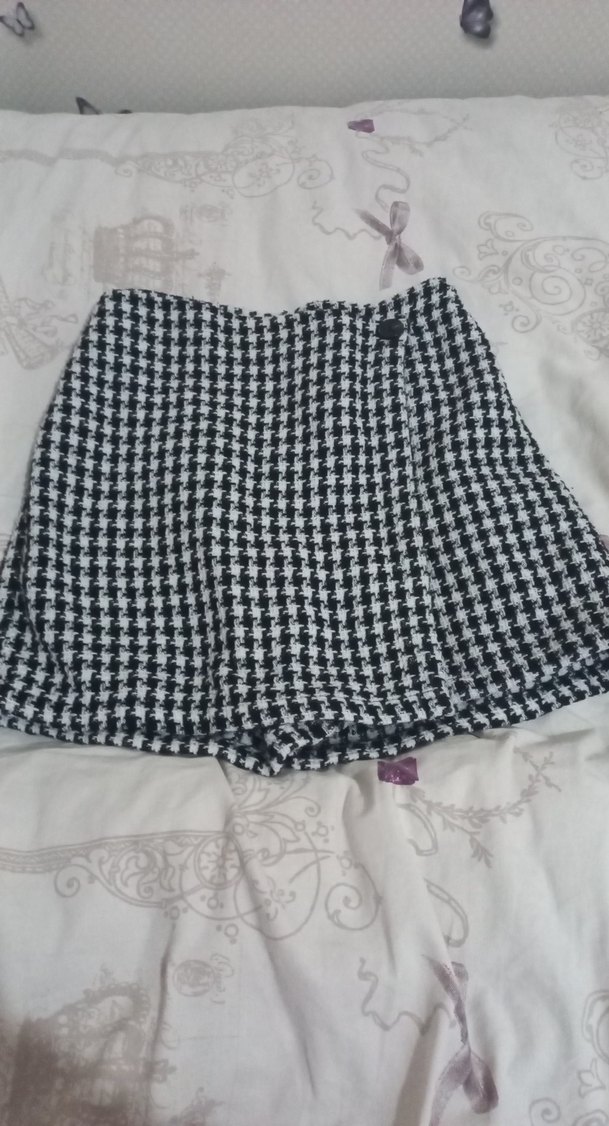 Düğmeli, siyah beyaz kazayağı desenli, sentetik kumaştan yapılmış, dar kesim mini etek.
