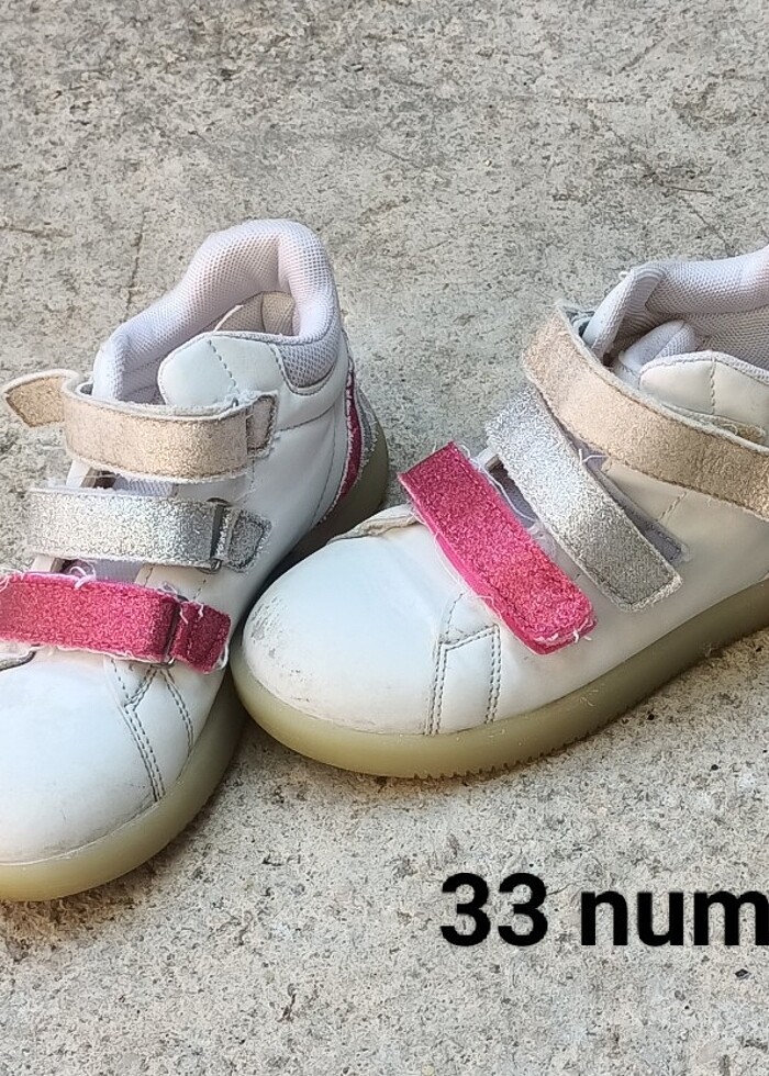 Ürün 33 numara vicco markadır. Az kullanılmıştır. Geniş kalıplıdır. Simli beyaz, pembe ve gri cırt cırtlı bantları mevcuttur asıl rengi beyazdır.