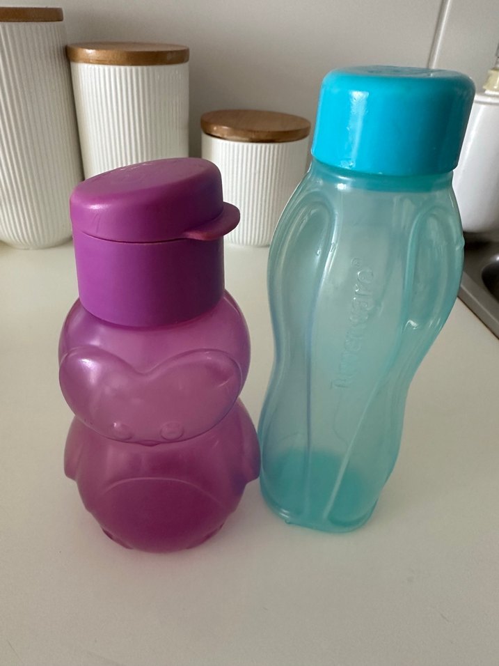 İki adet Tupperware su şişesi . Mor 350 ml yeşil 310 ml.ikili alımda ikisi 250 tl tek suluk 150 tl .Yeşil suluğun kapağında biraz soyulma var resimde gözüküyor.