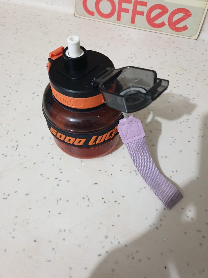 Renkli turuncu çocuk termos şişesi, pipetli kapak ve mor taşıma kayışı ile kolay kullanım sağlar. Üzerinde 'Good Luck' yazısı bulunur. Gayet sterildir herhangi kırık çatlak söz konusu değildir