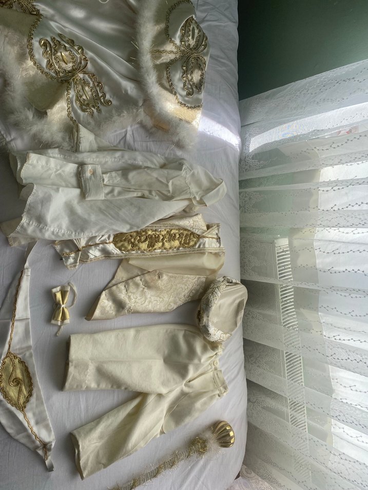 2-3 yaş arası için uygundur papyon kuşak pantolon şapka asa tüylü pelerin vardır resimde olan her şey gönderilecek aklınızda bir fiyat varsa yazın Dantel detaylı, vintage tarzda beyaz takım elbise. Bohem ve yenilikçi tarzlar için uygun, hafif ve şık bir parça. ✨