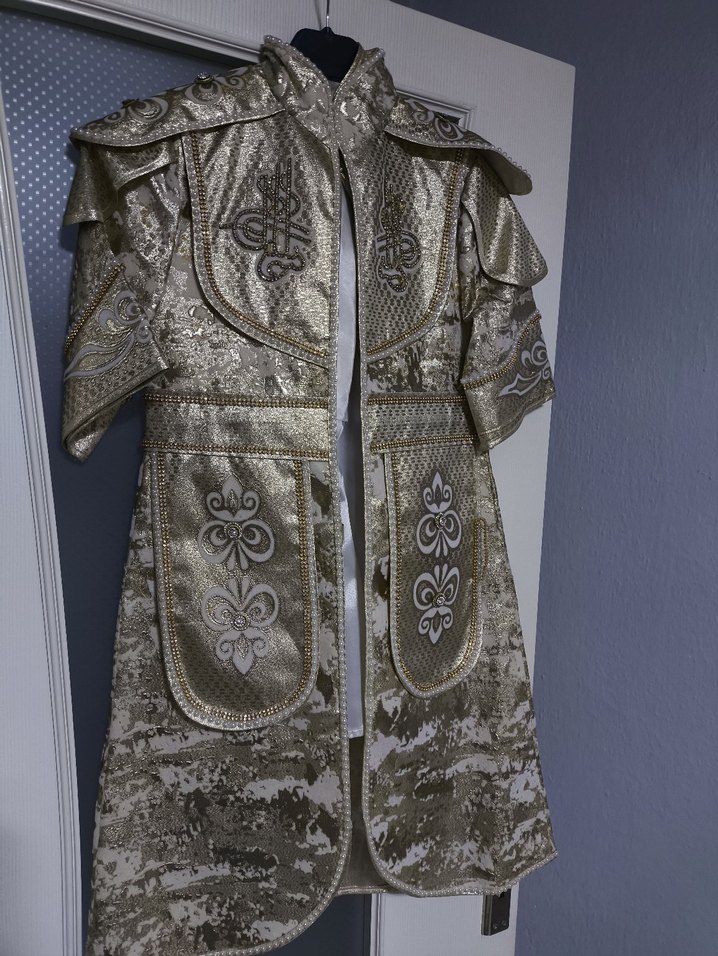 Nakış işlemeli, altın renkli, drapeli ve kolsuz çocuk kostümü. Notched lapel yakalı ve dar kesimdir. Avant-garde ve modaya uygun bir tasarıma sahiptir. ✨