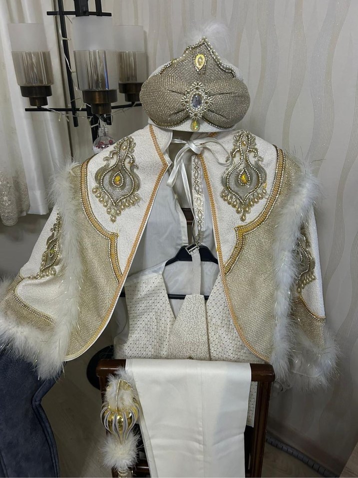 Çocuk Sünnet Takımı Krem Altın (Ertuğrul Takım) Fotoğrafta yer alan bütün kıyafeler şapka, elindeki asa gibi bütün ürünler fiyata dahildir. 3 numara, 8-9 yaş erkek çocuğuna uygundur. Ürün yalnızca fotoğraf çekiminde giyilmiştir.