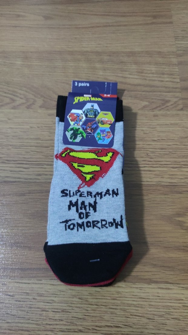 Gri tabanlı, Süperman ve Spiderman baskılı renkli erkek çocuk çoraplarından oluşan 3'lü set.