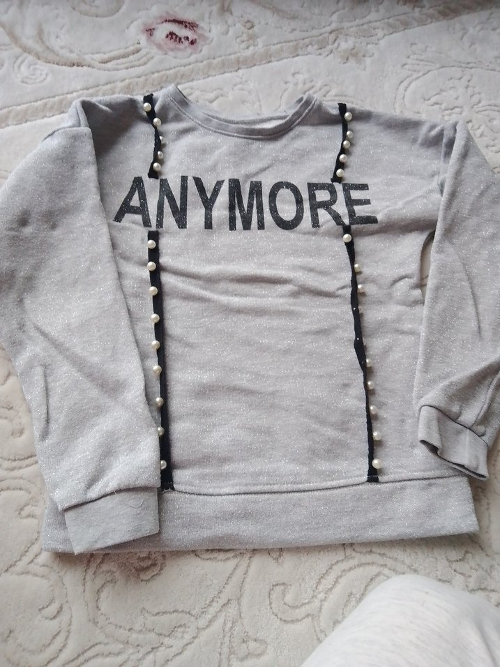 Gri örme kumaştan, uzun kollu ve yuvarlak yakalı, bol kesim sweatshirt. "ANYMORE" baskılı ve düğmeli detaylı, rahat ve şık bir parça.
