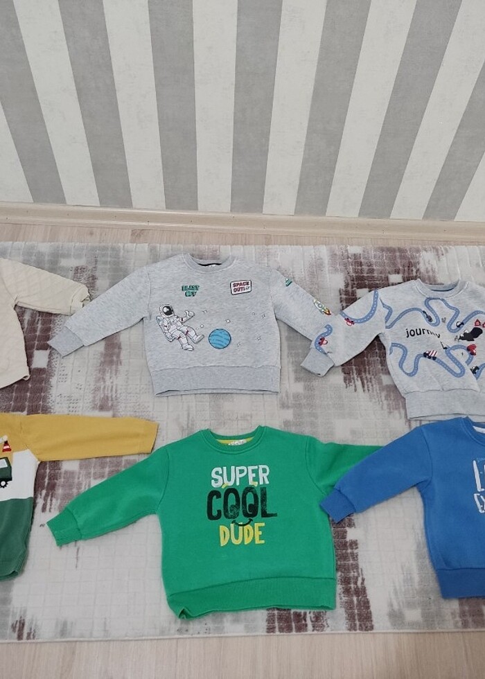 Farklı markalara ait şardonlu kalın sweatshirtler. Biri hırka biri trikodur diğer 4ü sweatshirt. 3-4 yaş uyumludurlar kalıpları dolayısıyla. Sökük yırtık yoktur. Tek ürün için fiyat sorunuz.