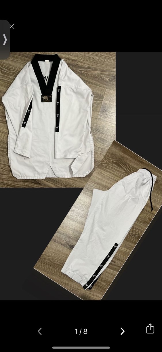 Kız/erkek 160cm taekwondo kıyafeti. Ön arka baskılı. Sol arka dizde kucuk leke var, son resimde. KUŞAKSIZdır.