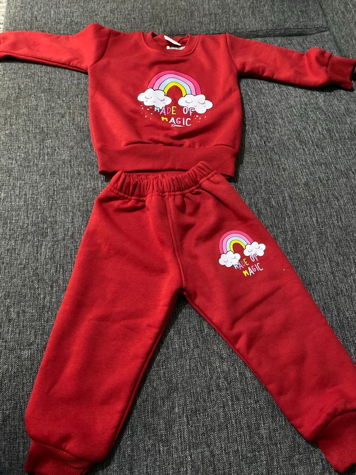 Kırmızı renkli, uzun kollu, triko kız bebek takımı. Üzerinde bulut ve gökkuşağı baskısı ile "Made of Magic" yazısı bulunur. Sıfır üründür pamuklu