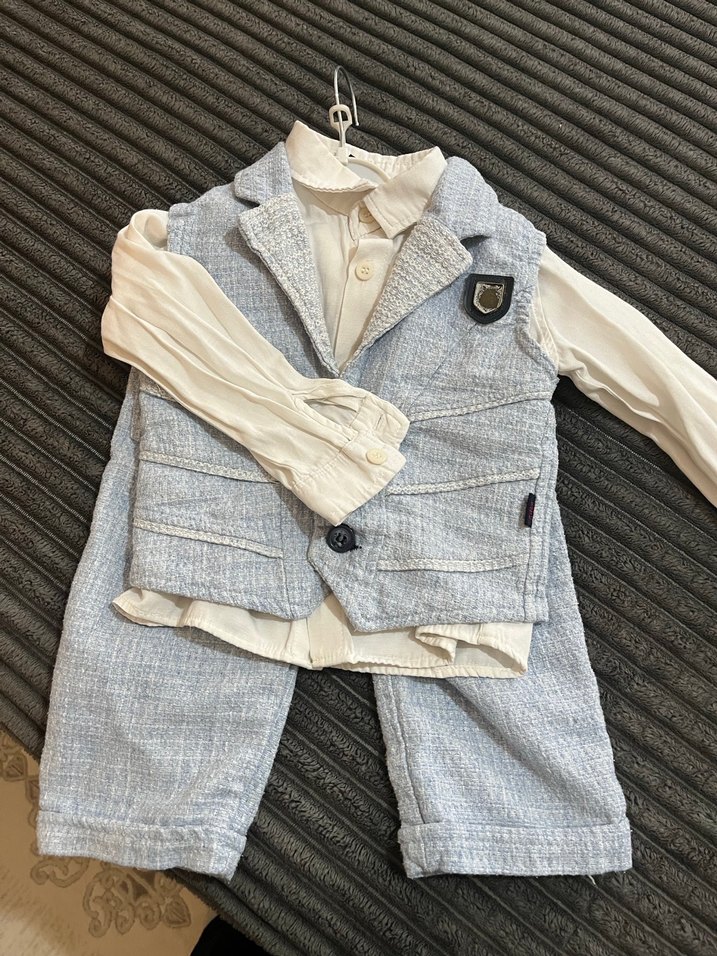mavı renkli çocuk takımı, düğmeli yelek ve uzun kollu gömlek ile notched lapel yakaya sahip, rahat kesim ve trend sokak stili sunar. yenı 3 kez gıyıldı çok kalıtelı