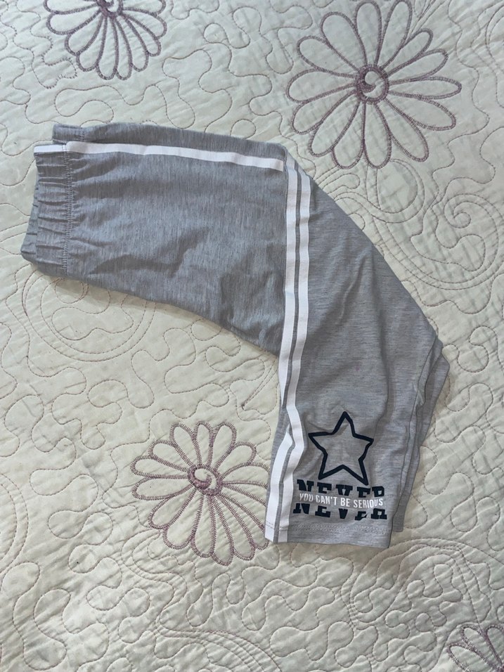 Gri, pamuklu, bol kesim tayt. Midi boy, yan şerit detaylı, fermuarlı cepli ve yıldız baskılı. ♀️
