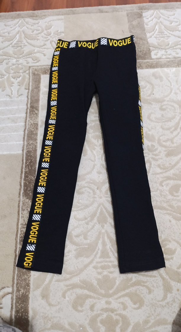 Siyah, yanlarda sarı 'VOGUE' baskılı çizgiler bulunan, esnek bel bantlı, yumuşak ve sıcak kumaştan yapılmış kadın taytı. Spor ve günlük kullanıma uygun.