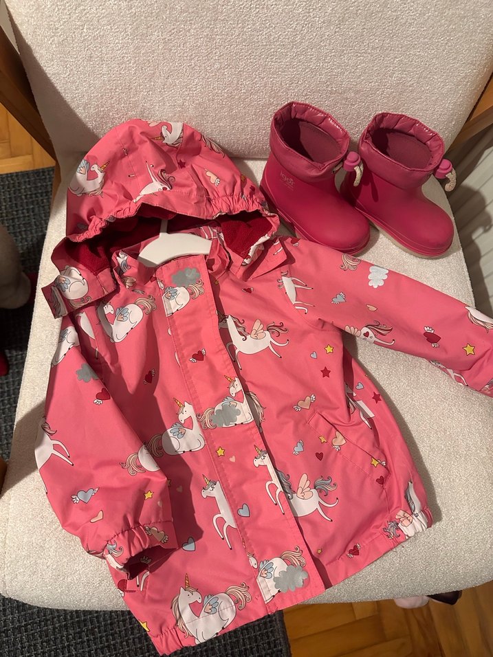 Kapüşonlu, pembe baskılı kız çocuk yağmurluğu, yumuşak polar astarlı ve cırt cırtlı, rahat kesim şık sokak stili için uygundur. ️