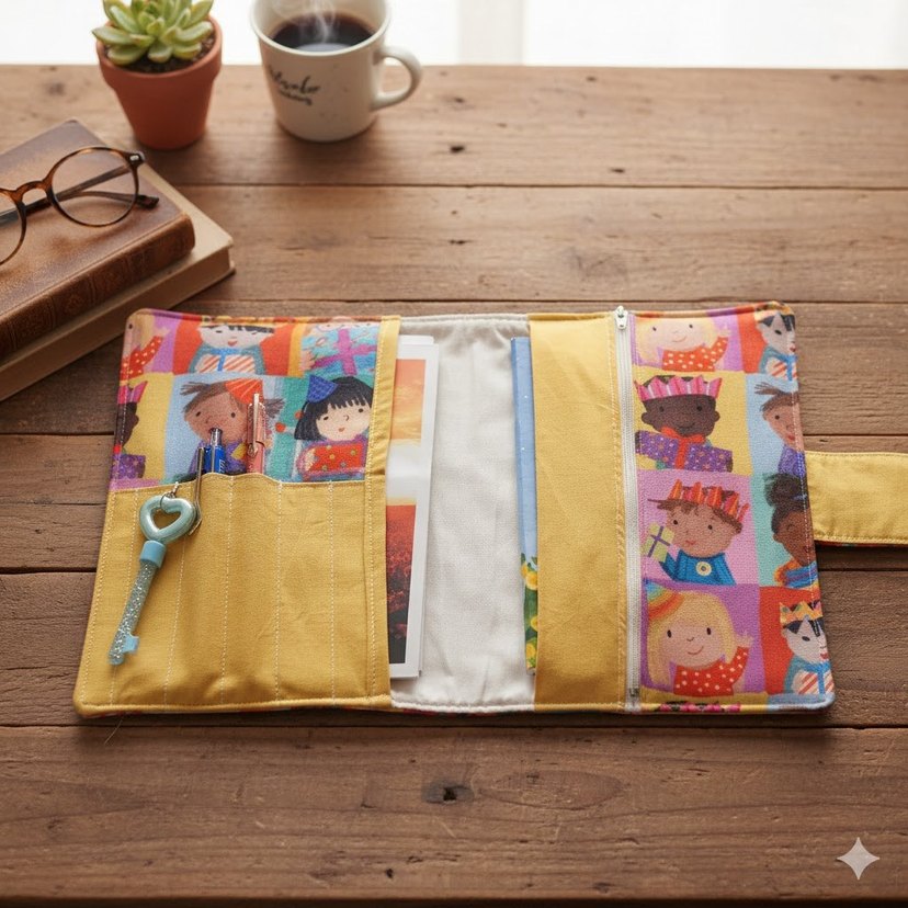 Pastel renklerde, çok bölmeli cepleri olan, oyuncu karakter desenli yumuşak kumaş kaplı planlayıcı. ️