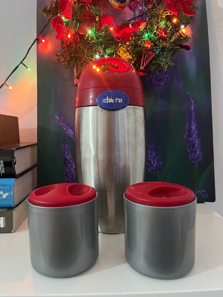 Paslanmaz çelik çocuk termosu kırmızı kapaklı ve iki gri-kırmızı bardakla birlikte sıcak mamalar için uygundur.