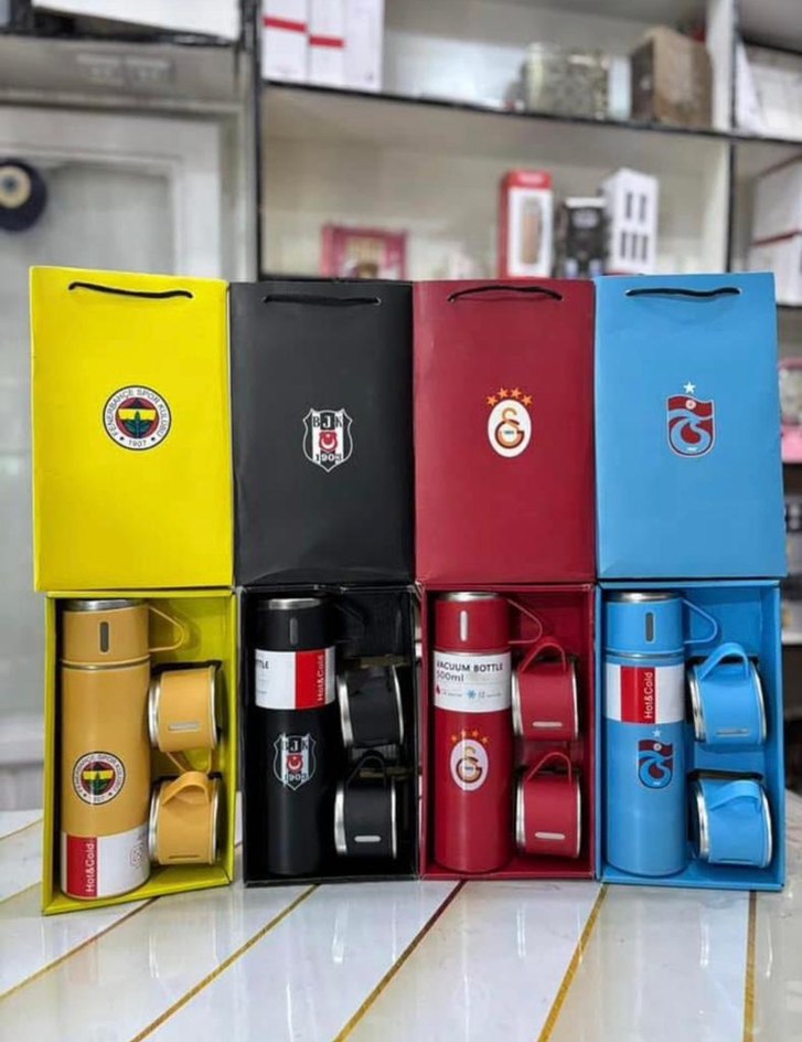 Popüler futbol takımı logolu, renkli çocuk termos setleri. Her set vakumlu şişe ve uyumlu bardak içerir, içecekleri sıcak tutar.