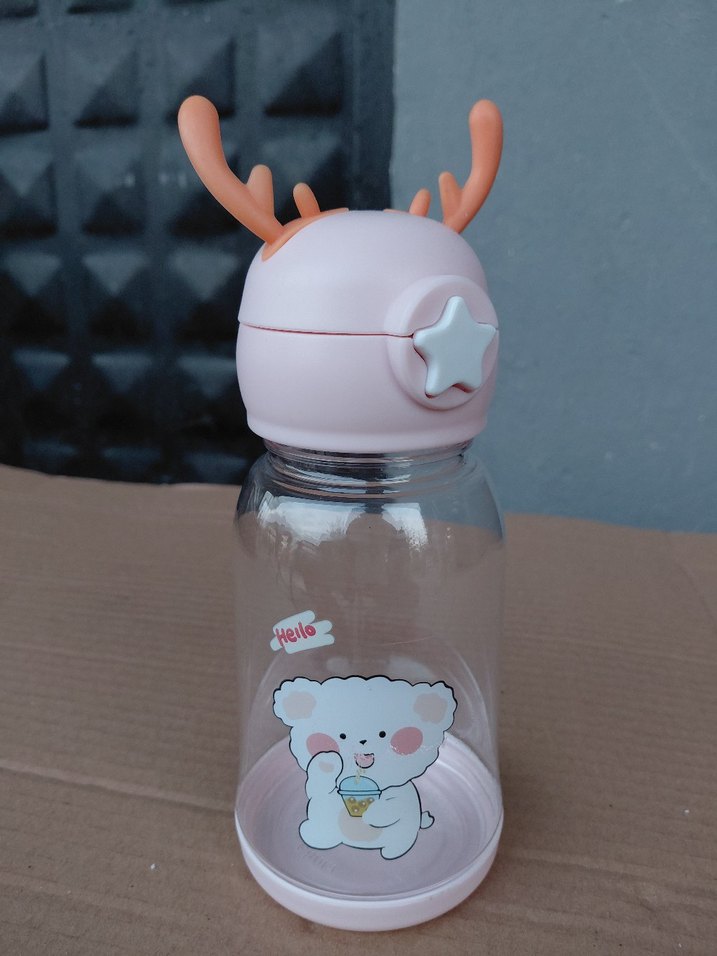 Pastel pembe renkli, kulakları boynuz şeklinde kapaklı, sevimli ayıcık desenli çocuk termos şişesi. İçeceklerin sıcak veya soğuk kalmasını sağlar.