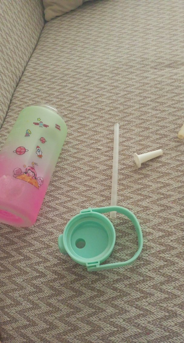 Pembe pastel renkli çocuk termos şişesi, uzay temalı eğlenceli desenlere sahiptir. Çıkarılabilir pipet ve taşıma sapı ile kullanımı kolaydır. az kullanildi 2lt