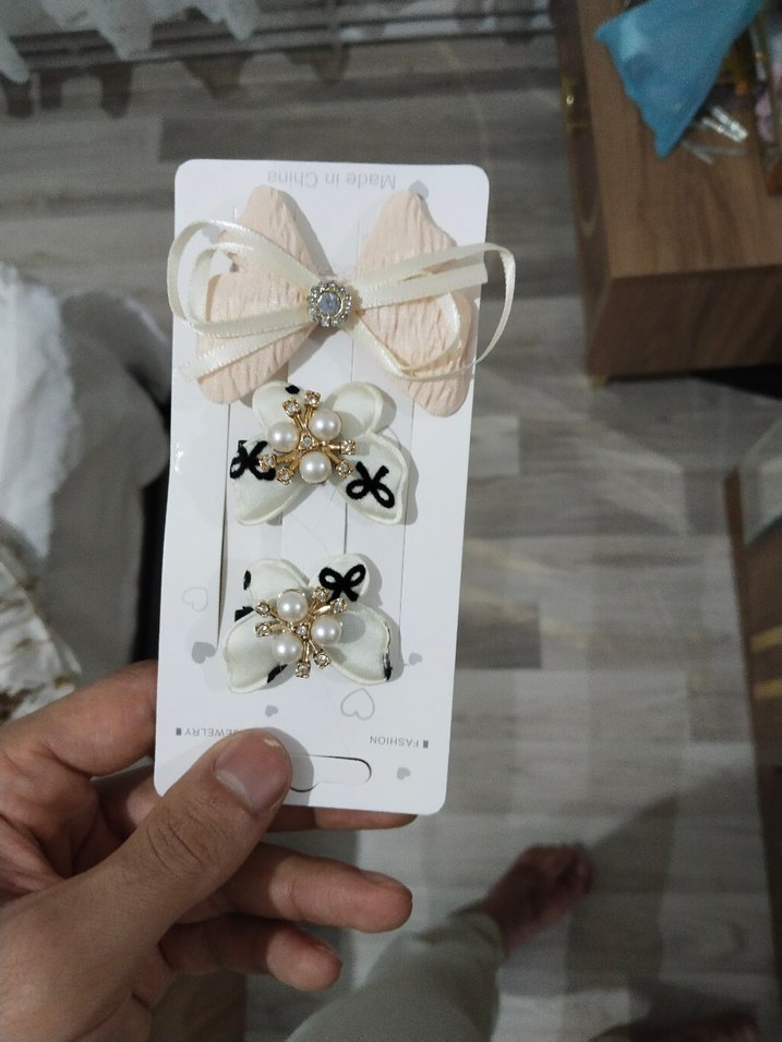İnci ve küçük siyah fiyonk detaylı beyaz çocuk tokası seti, bohem tarz için uygun.