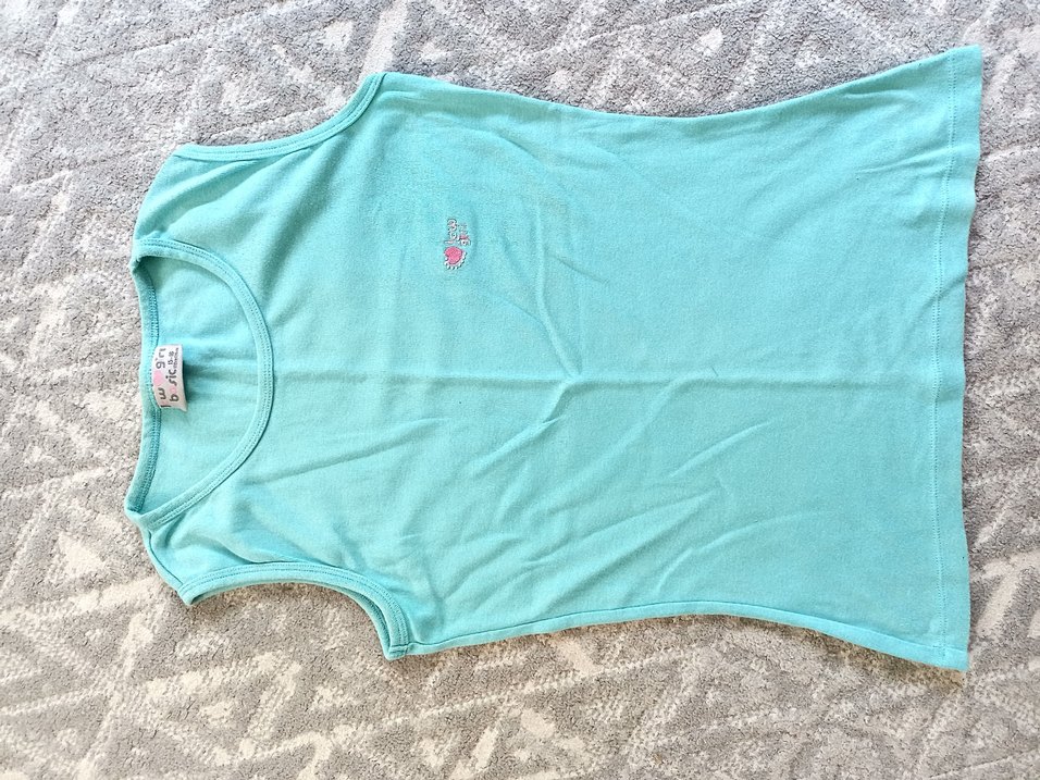 Turkuaz renkte, küçük işlemeli detaylı, düz kumaştan yapılmış çocuk atleti. Rahat bir kullanım sunar.