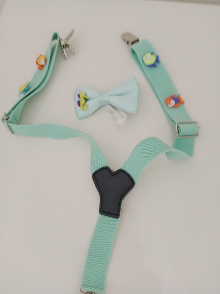 Turkuaz renkli, sentetik kumaştan yapılmış, renkli bağlama desenli klipsleri ve uyumlu papyonu olan çocuk askısı seti.