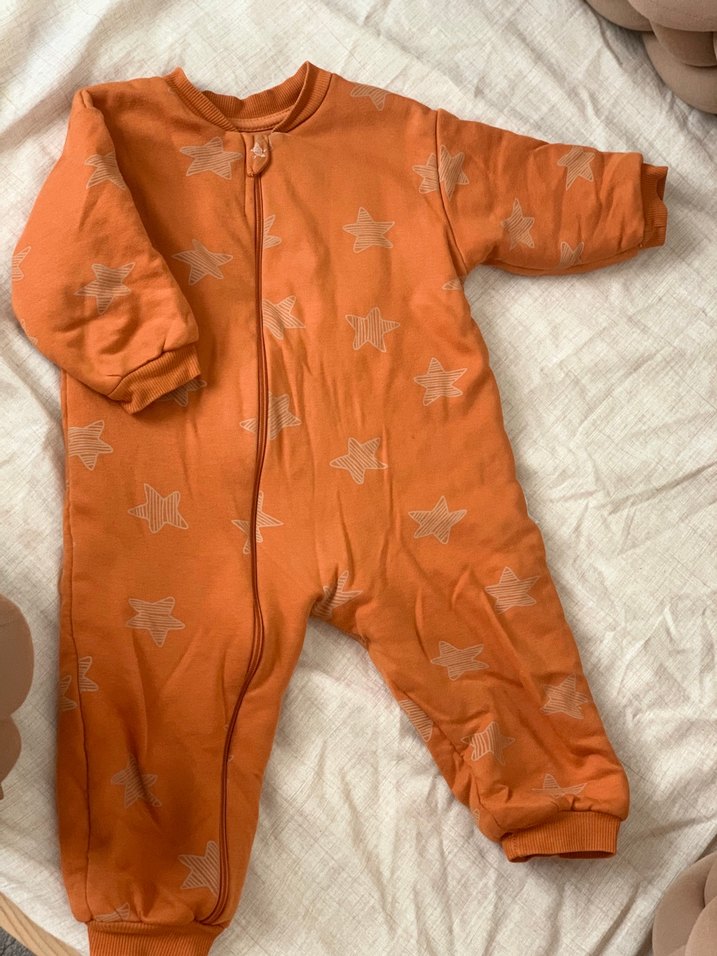 Pastel turuncu renkte, uzun kollu ve yuvarlak yakalı fermuarlı uyku tulumu 2.5 tog 24-36