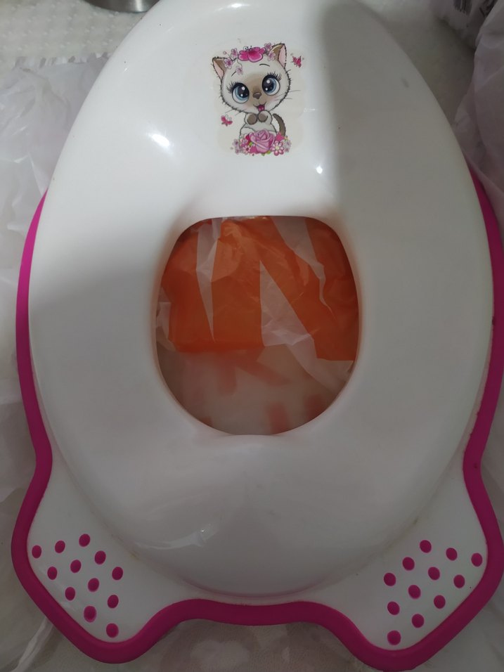 Pembe kenarlı ve sevimli kedi figürlü çocuk tuvalet adaptörü, konforlu ve eğlenceli tuvalet eğitimi sağlar.