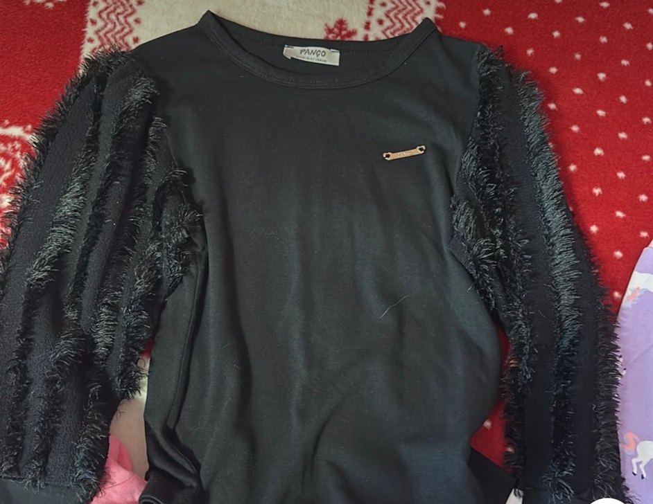 Bu siyah, kısa ve vücuda oturan bluz uzun kürklü kollar ve yuvarlak yaka ile tasarlanmıştır. Yumuşak sentetik kumaştan üretilmiş olup, PANÇO markalıdır. 9 adet ürün gelecektir.
