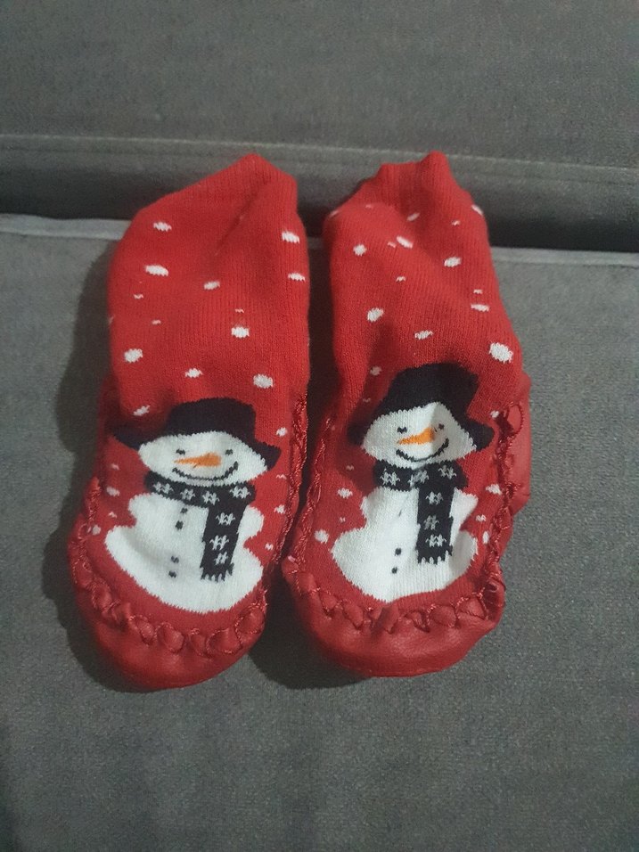 Yumuşak polar kumaştan, kırmızı renkli ve renkli nakışlı kardan adam desenli cocuklar için örgü sıcak terlikler. ❄️