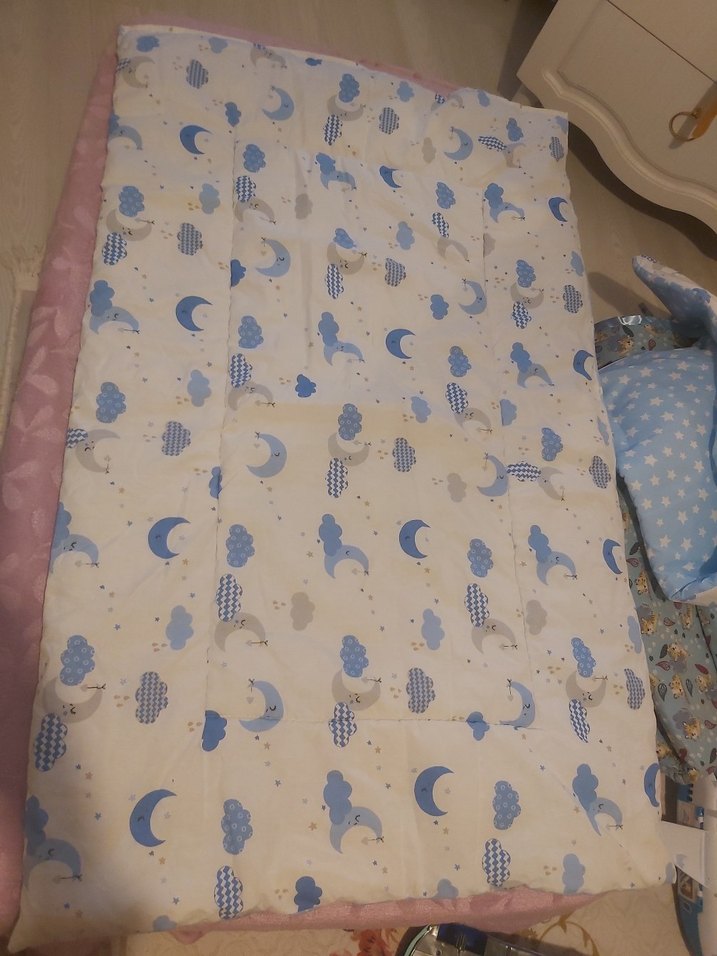 Sentetik kumaştan yapılmış, bulut ve ay desenli pastel mavi çocuk uyku seti Yumuşak ve rahat.