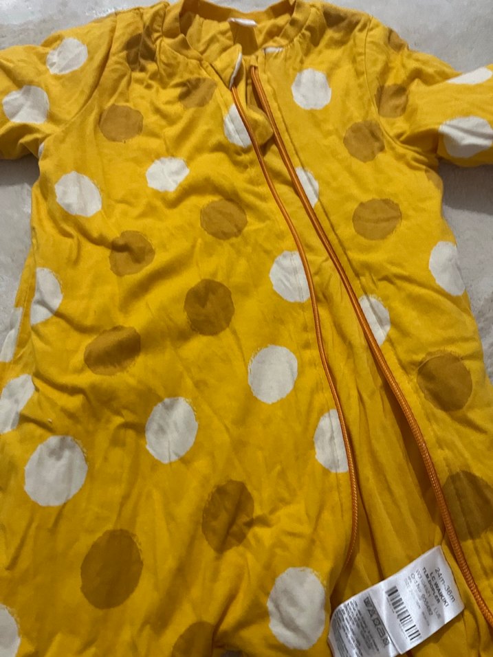 Ürün: 1,5 tog uyku tulumu Beden: 24-36 ay Renk: Sarı zemin üzerinde beyaz ve hardal puantiyeli Durum: Temiz, yumuşak kumaş, fermuarı sorunsuz çalışıyor Açıklama: Rahat ve sıcak tutan, terletmeyen ince dolgulu uyku tulumu. Ev içinde veya uyku sırasında güvenle kullanılabilir.çocuğum için aldım fakat hiç giymek istemedi
