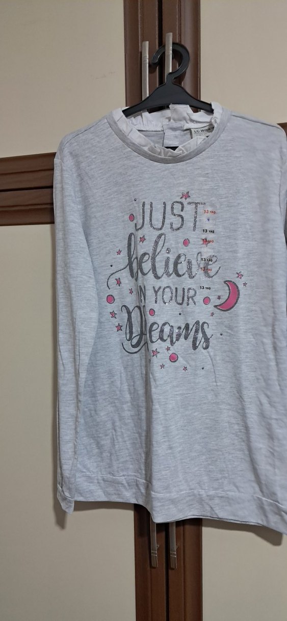 Gri renkli, pamuklu kız çocuk uzun kollu tişört. Salaş kesim, yuvarlak yaka ve omuzda düğme detayı bulunur. Üzerinde 'Just believe in your dreams' yazılı baskı yer alır. 12-13 yaş için uygundur.