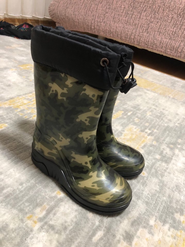 kamuflaj desenli, lastik malzemeden yapılmış, çocuk çizmesi.