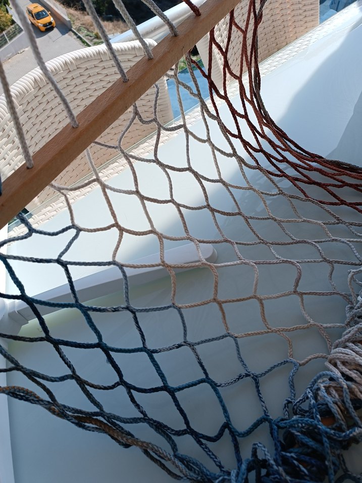 Gri ve mavi tonlarında çocuk yatakları için güvenli ve eğlenceli bir file. ️ hamak aldık bir kere kullandık