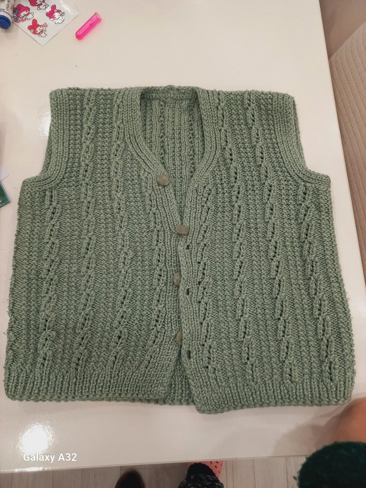 Yeşil, V yakalı ve örgü dokulu kolsuz süveter. Bohem tarzda, günlük kullanım için uygun, normal kesim