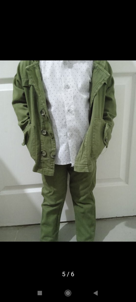 Çocuklar için yeşil düğmeli takım, kesimli yaka ve uzun kollu, rahat kesim ile sade ve trend bir görünüme sahiptir.
