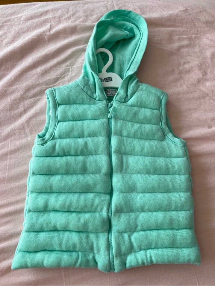 çocuklar için yeşil kapüşonlu, fermuarlı ve yumuşak dokulu kolsuz yelek. Sokak stiline uygun, dar kesim ve yüksek yakalı.