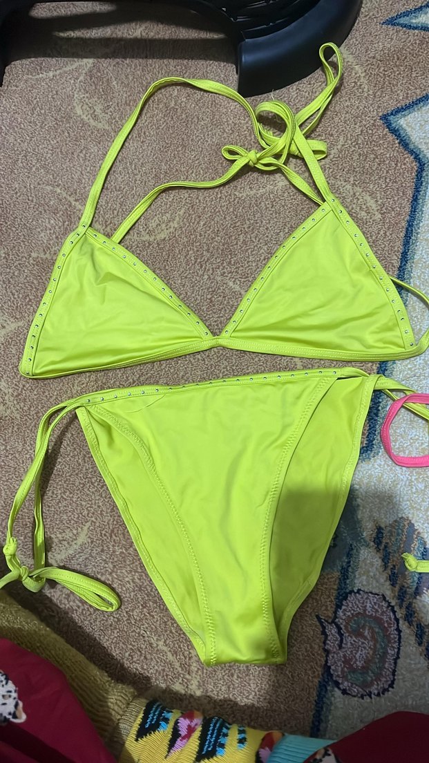 Sahilde kullanıma uygun, payet detaylı, ince askılı, hafif yeşil renkli ve vücuda oturan bikini takımı. Midi boy ve athleisure tarzında.